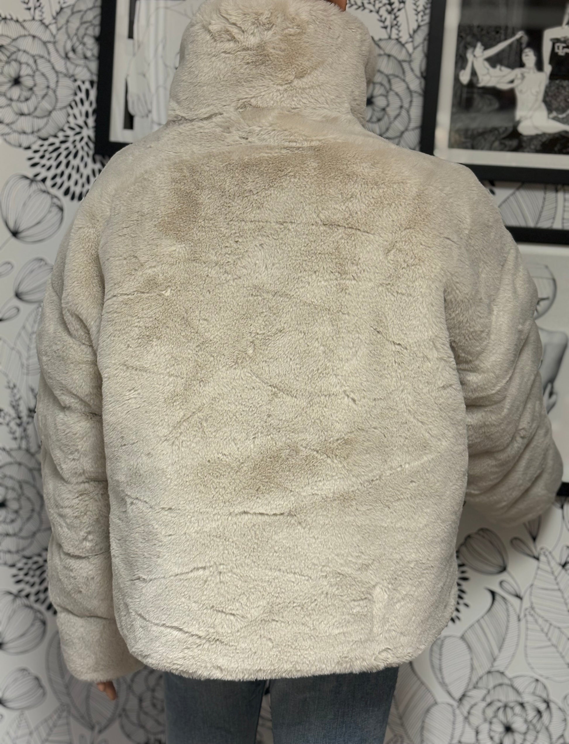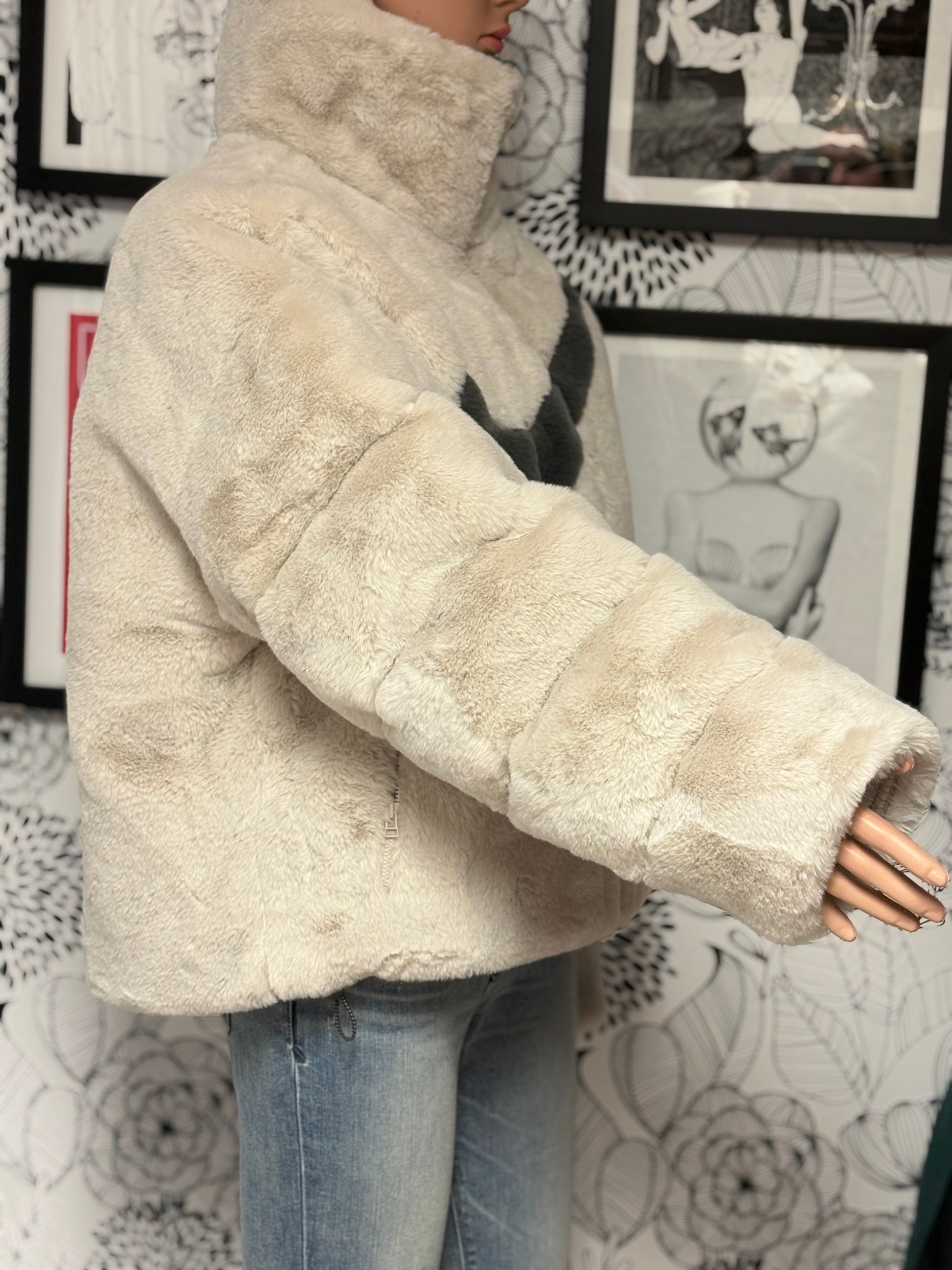 Made of ultra-plush faux fur with a structured high collar and relaxed, bubble-puffer fit. Cozy, warm, statement-making.