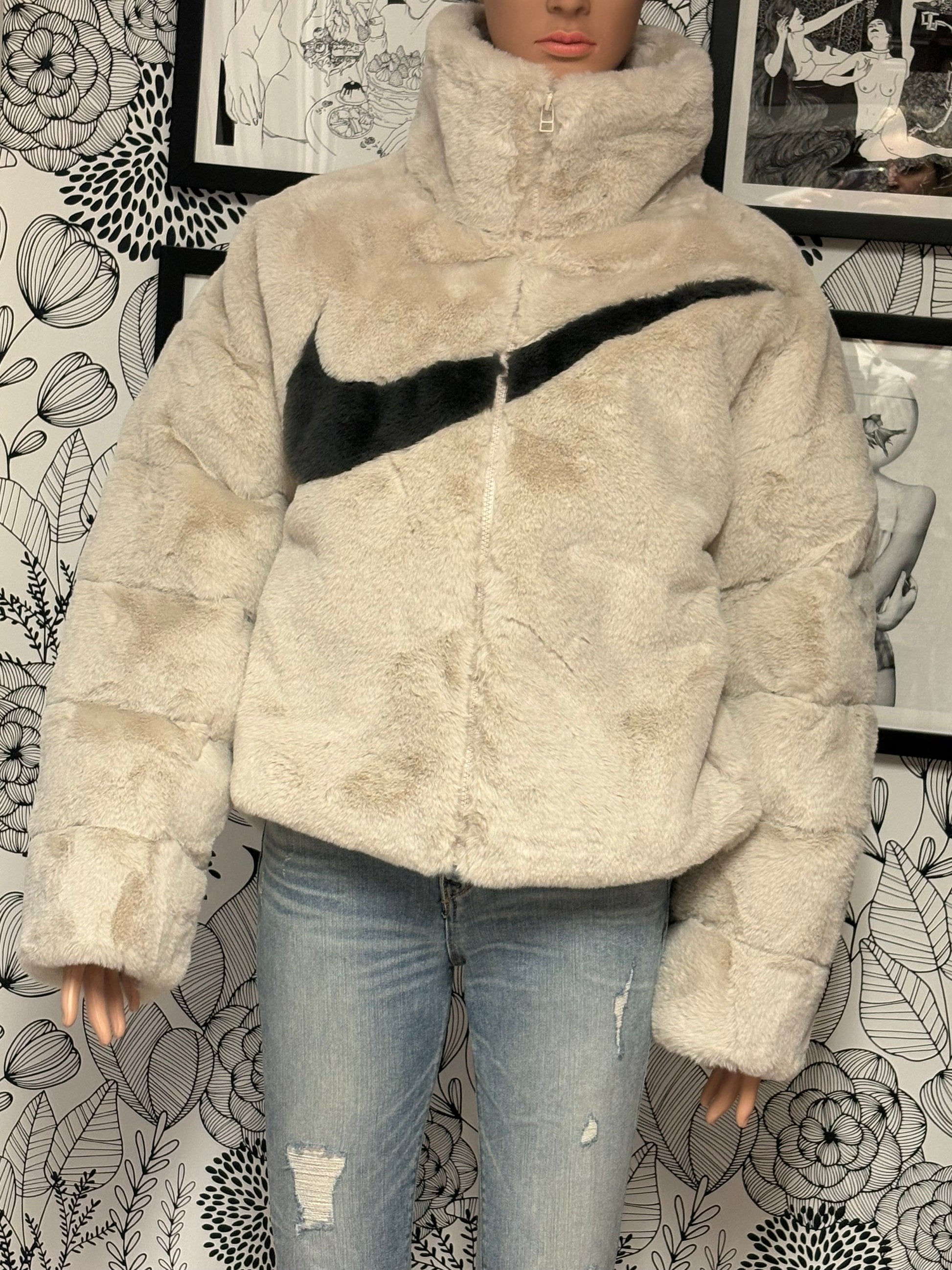 Nike Sportswear Women’s Faux-Fur Swoosh Puffer Jacket – Fossil/Black (Rare, Size Small)