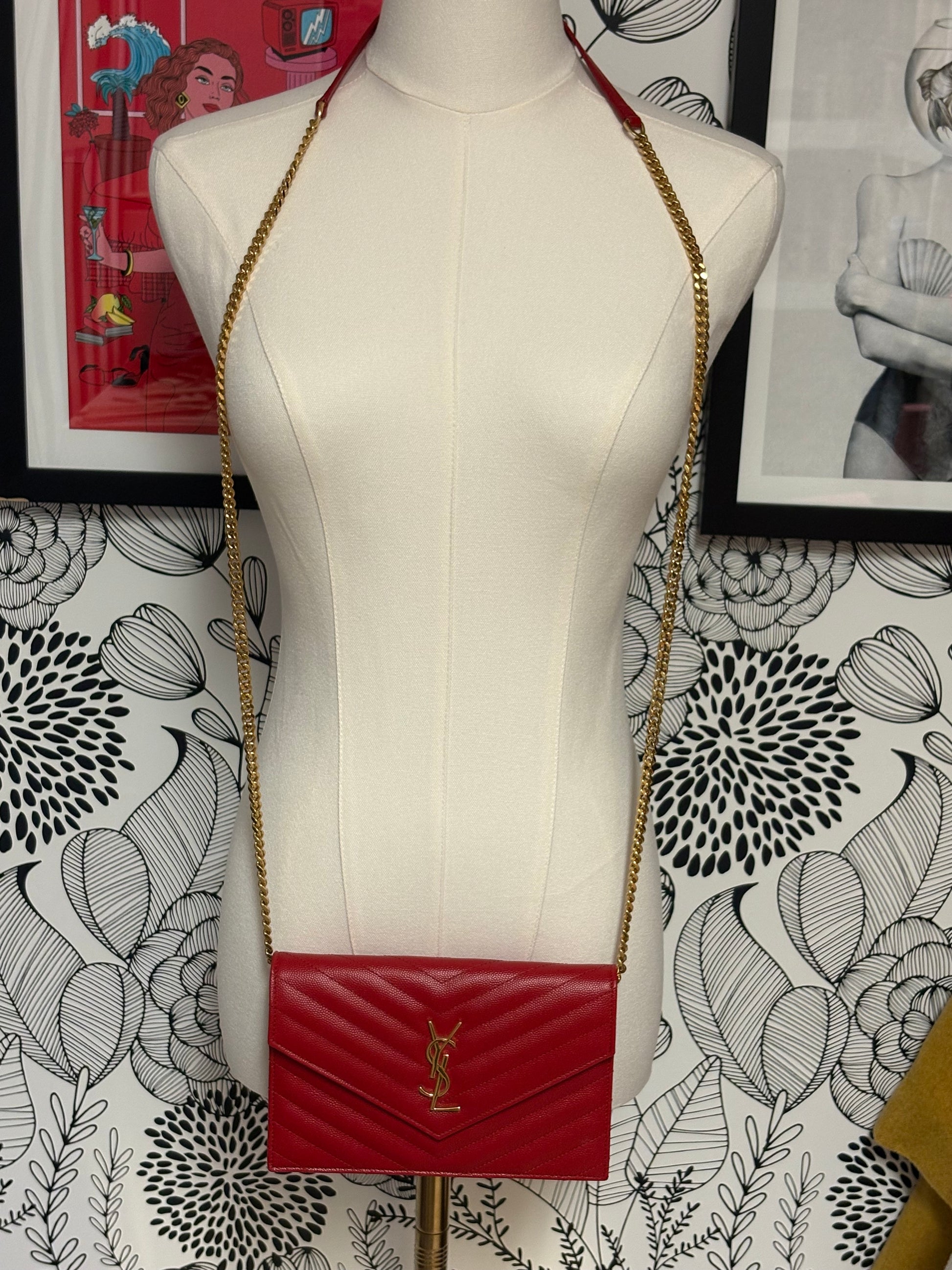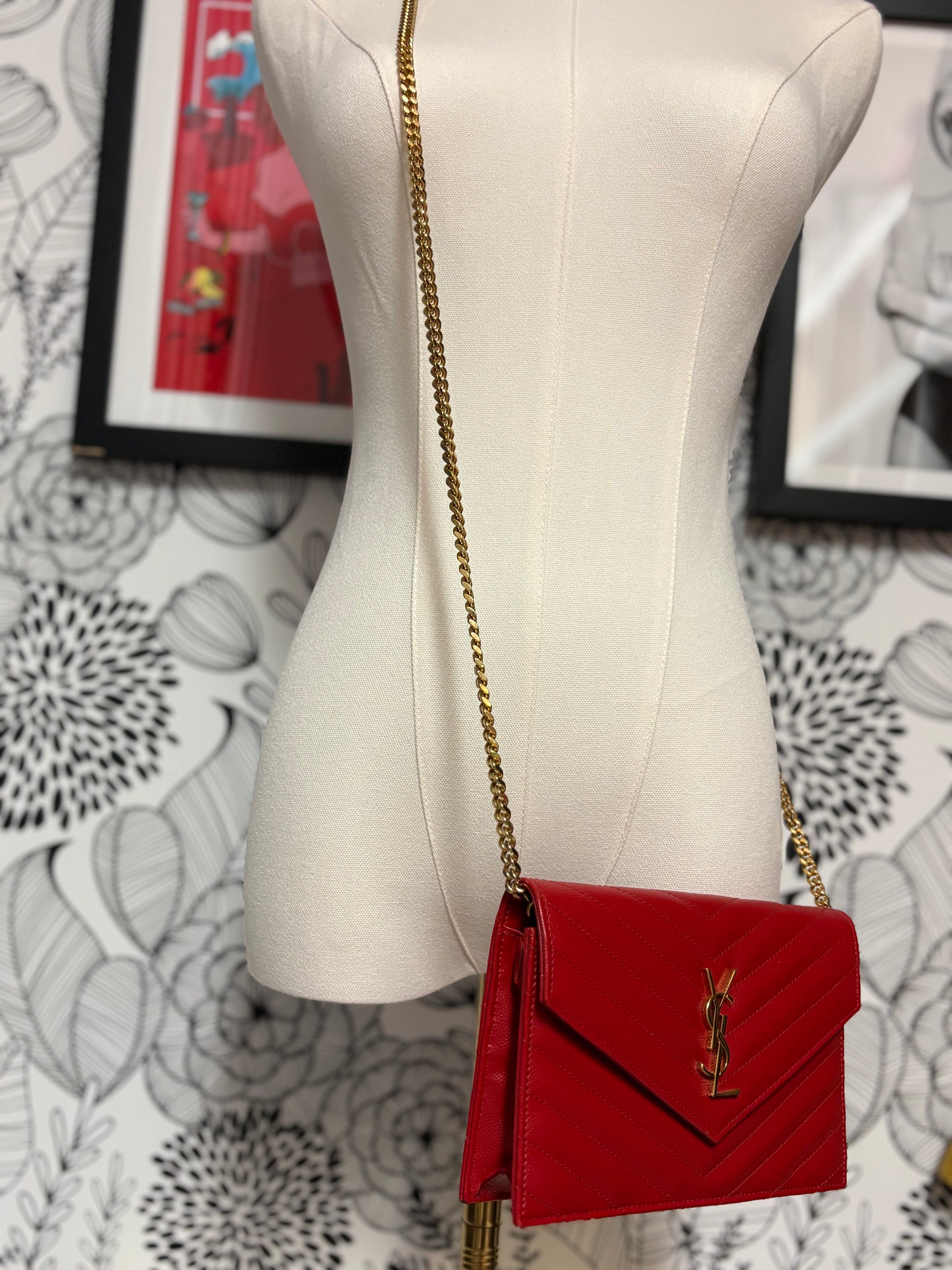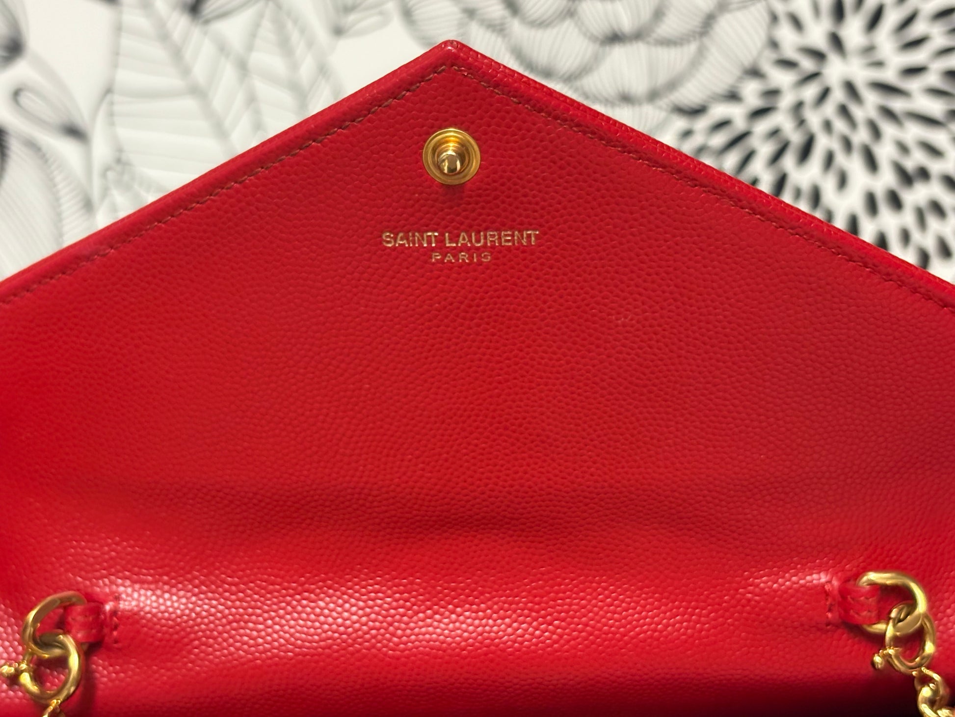 Saint Laurent Cassandre Envelope Chain Wallet in Lambskin – Deeply Red Current Retail: $1,500 + tax (direct from YSL)